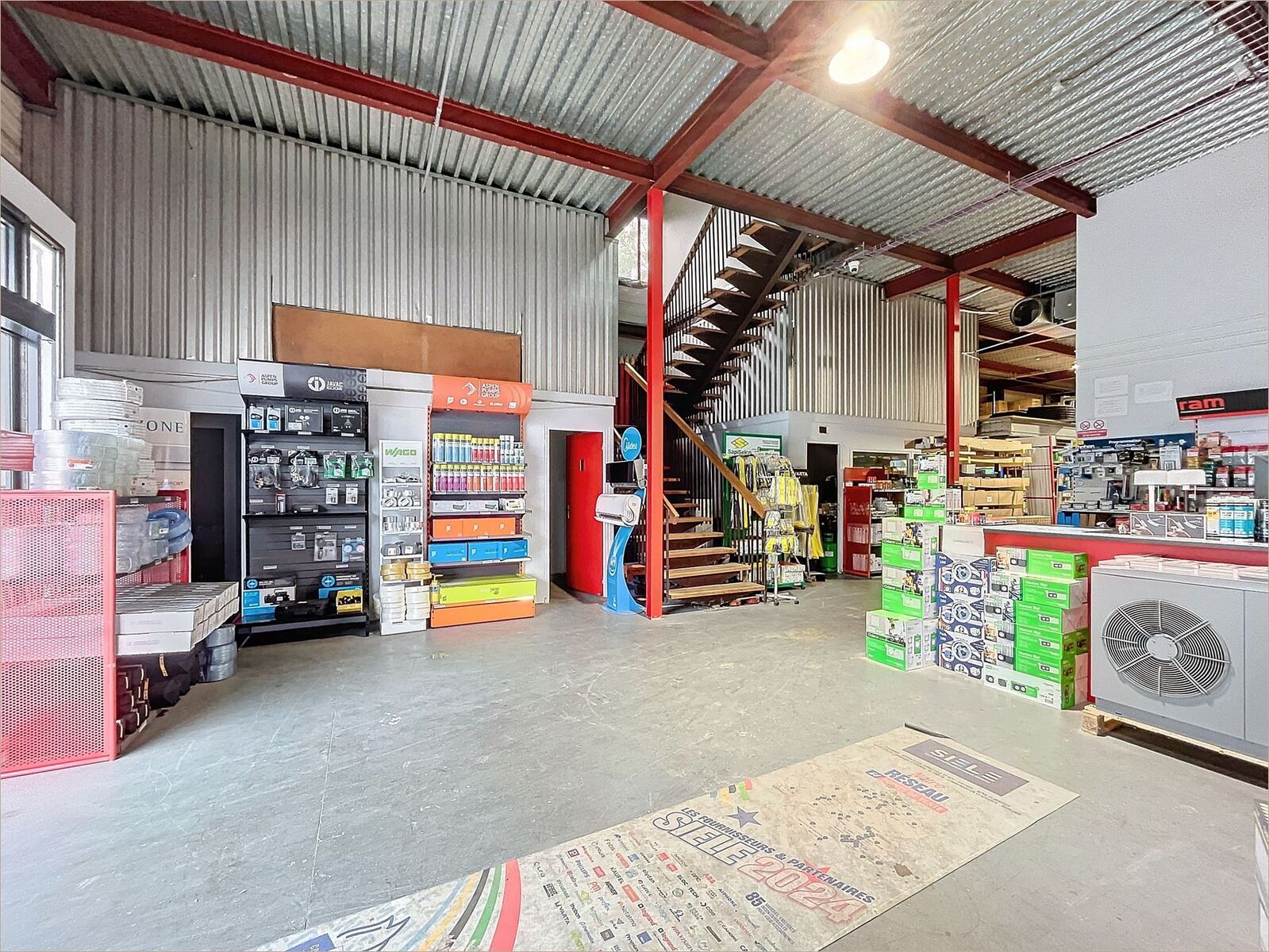 Accès livraison par portail coulissant Vitrine pour showroom Bureaux d'accompagnement Locaux climatisés R+1 bac collaborant avec dalle béton