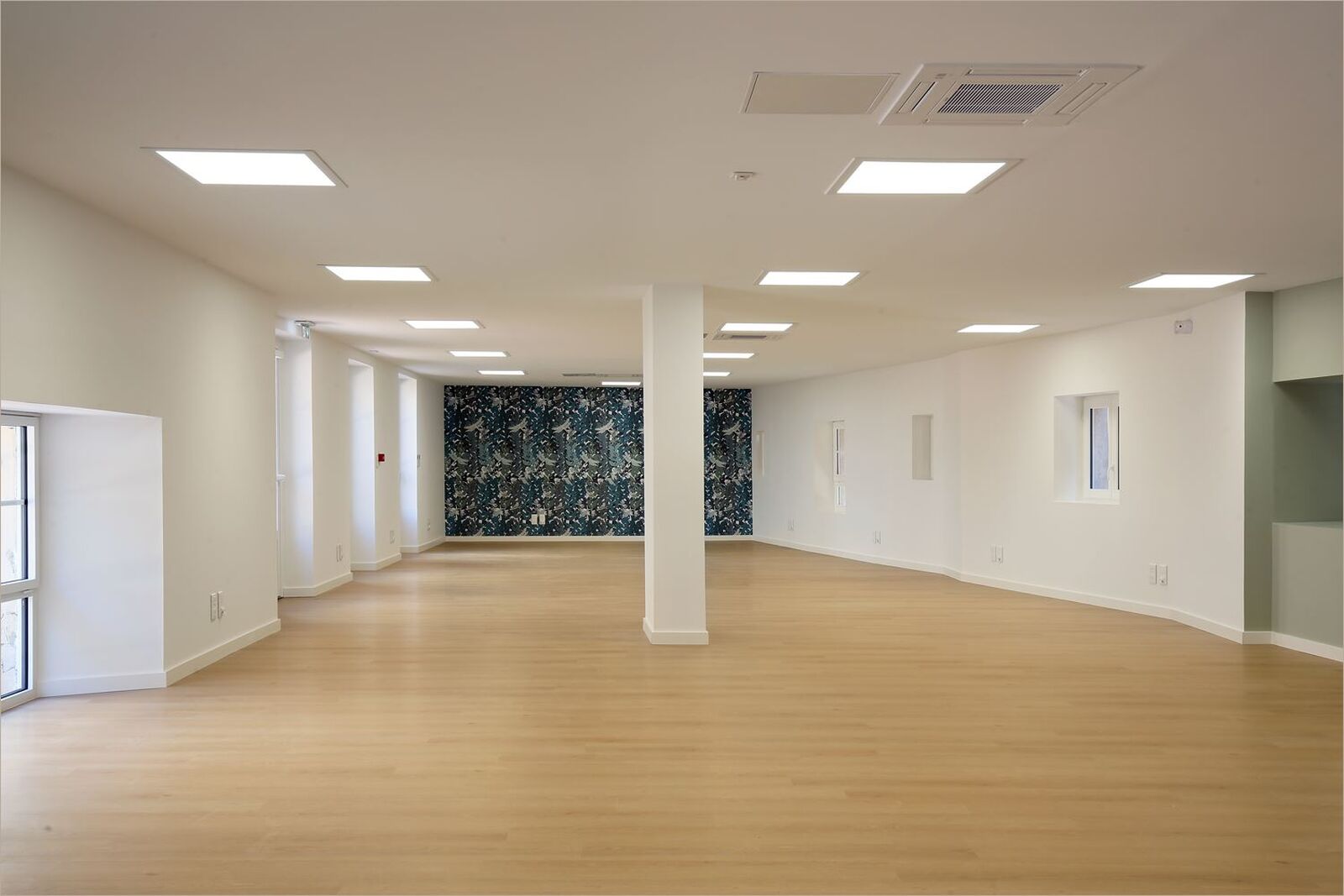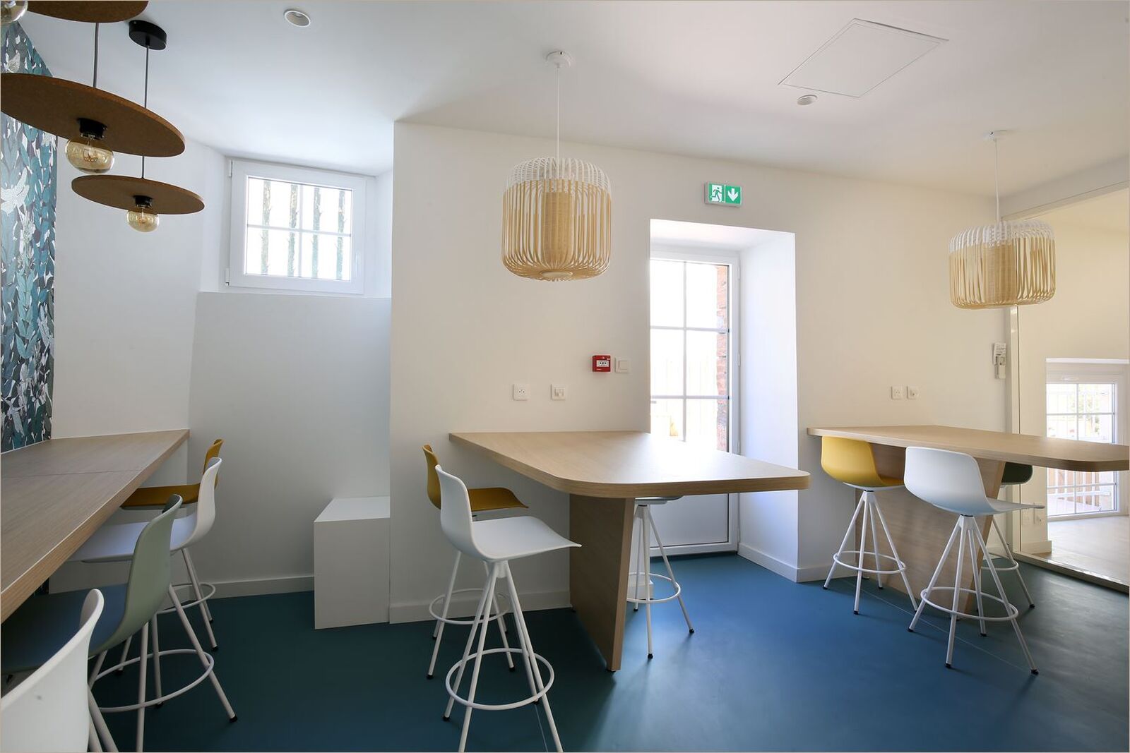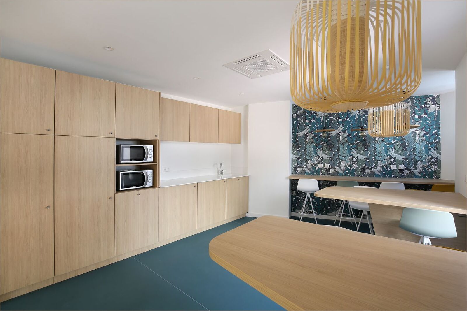 Le plateau est livré partiellement cloisonné : open space, 2 bureaux, une grande cuisine aménagée et équipée Système de climatisation réversible Câblage informatique Grande terrasse privative d'environ 130 m² au calme sur cour