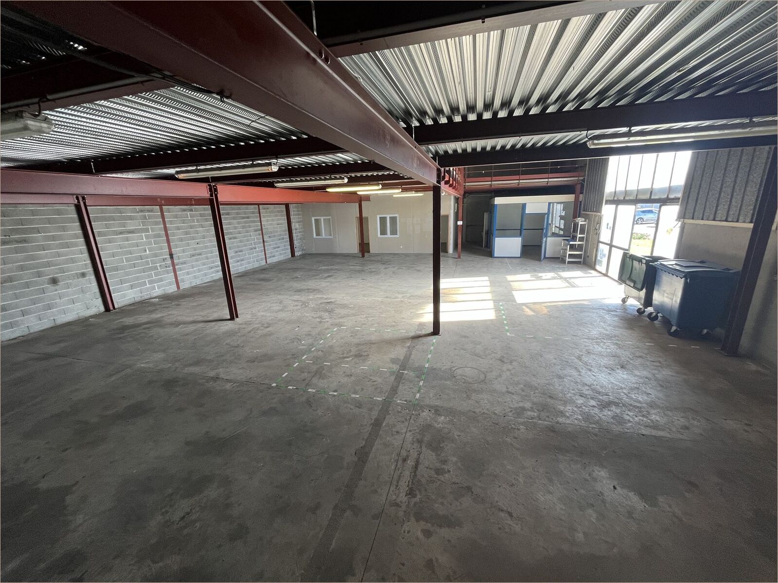 Une partie bureaux climatisées de 74 m² environ, avec sanitaires et douche Salle de pause Dépôt avec dalle béton d'une surface de 274 m² Accès livraison double porte, rideau de protection électrique Triphasé Mezzanine d'une surface de 288 m² environ