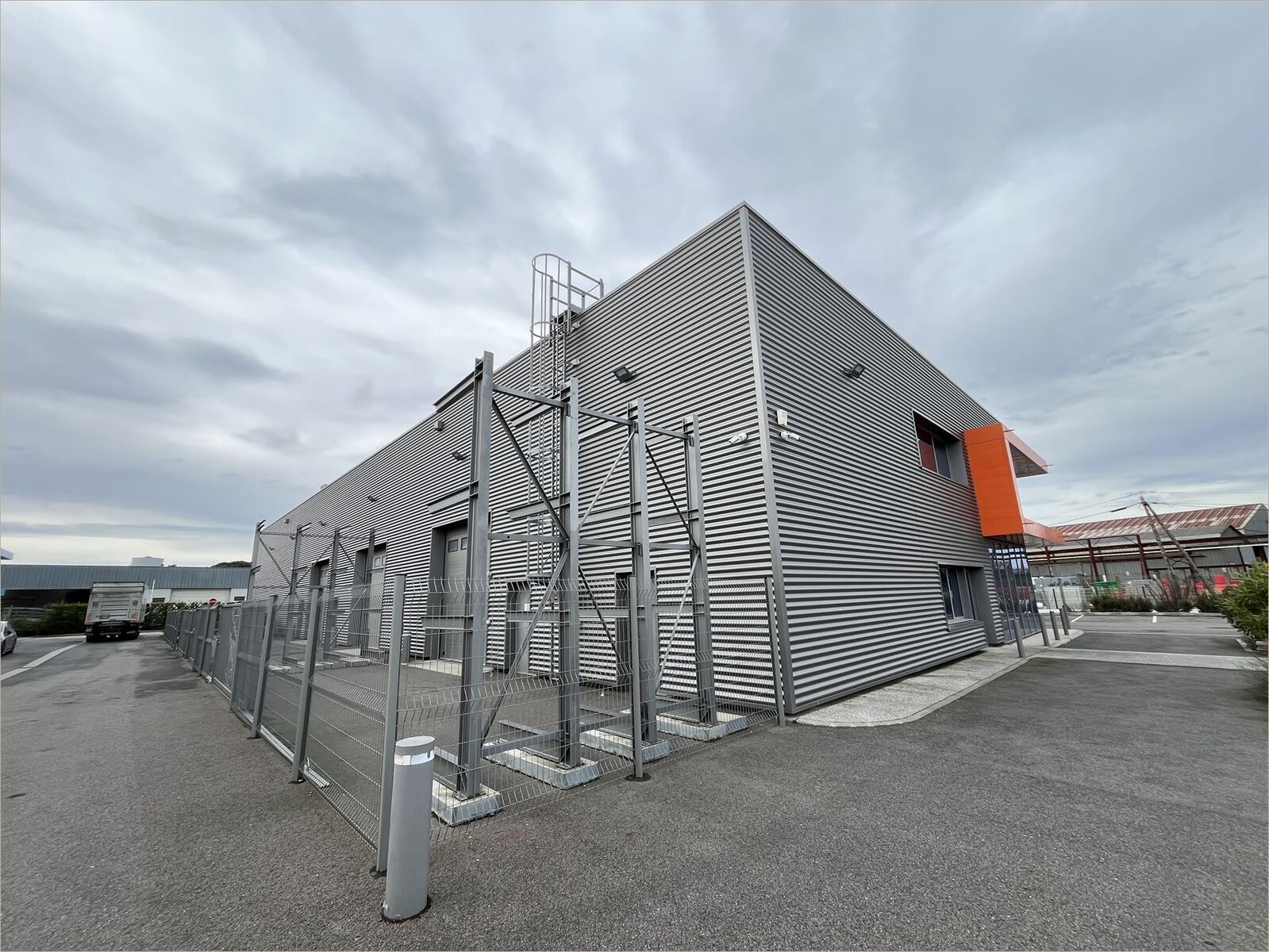 Bâtiment type structure métallique Bardage double peau Zone clôturée avec portail coulissant