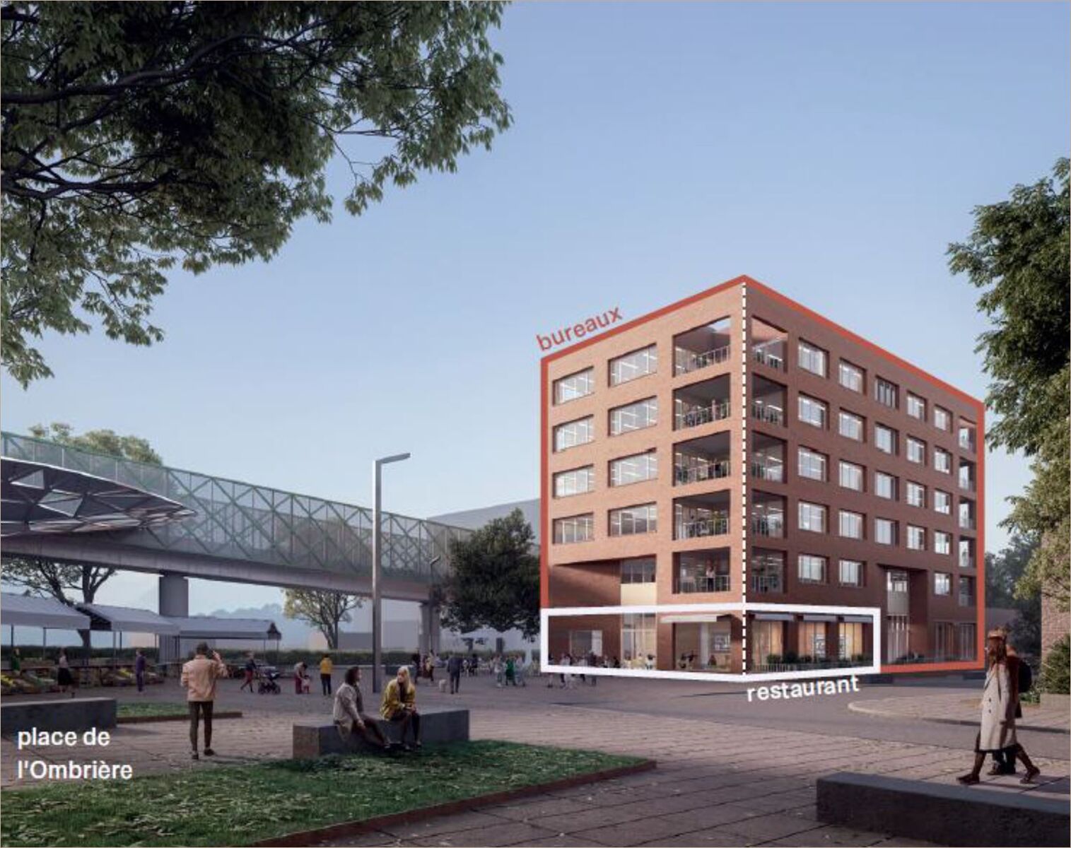 Plateaux d'environ 500 m² divisibles en deux et disposant chacun d'un espace extérieur (terrasses d'environ 25 m² à chaque étage à partir du R+1) Surface livrées en plateaux nus (hors cloisons) Plancher technique et faux plafond Production photovoltaïque en toiture Capacitaire : 1 poste / 10 m² ERP 5ème catégorie type W Local vélos, douches et vestiaires Labélisations : - BREEAM Niveau Excellent - BEPOS EFFINERGIE E 3 C 1