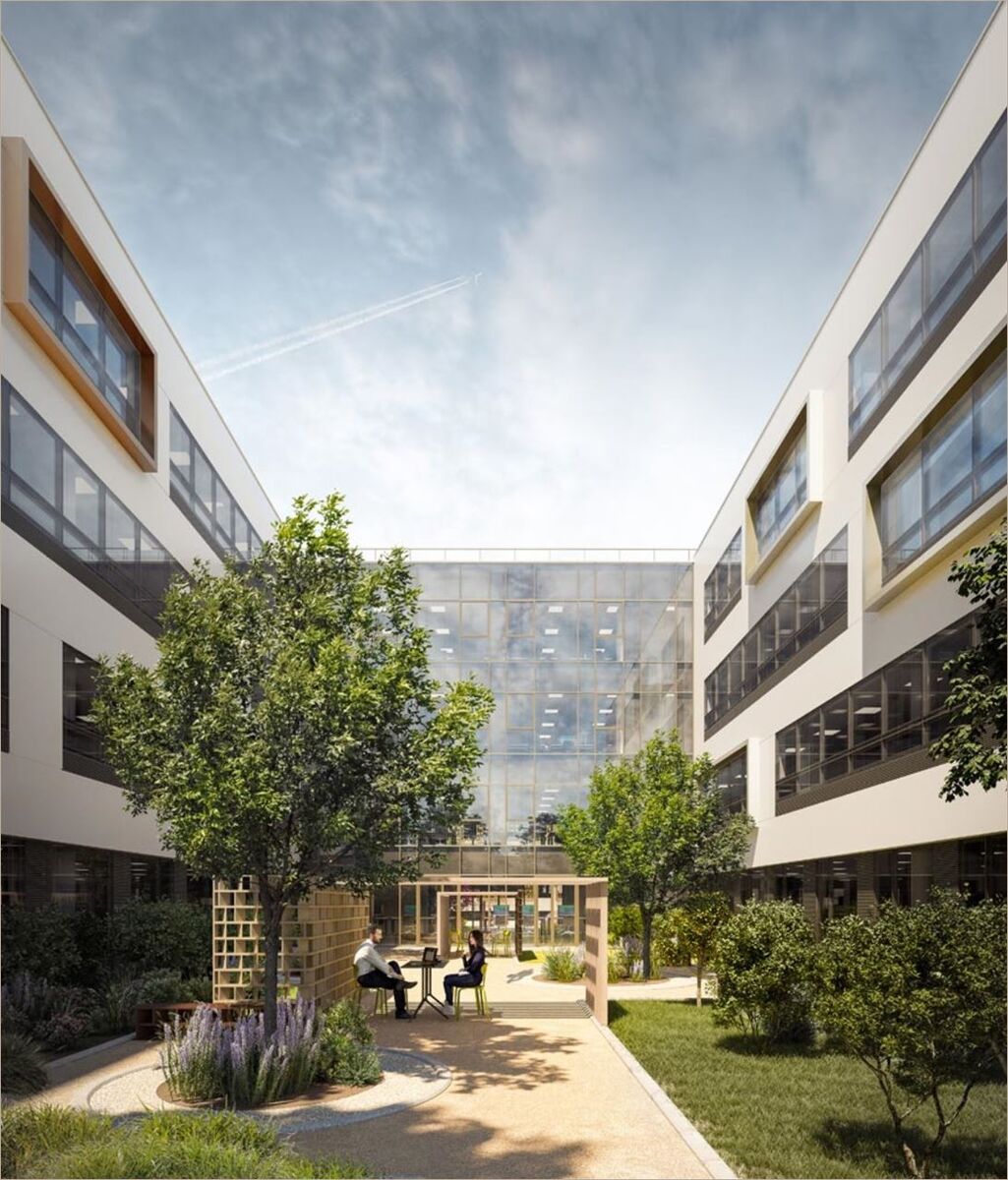 Programme de bureaux en R+3 Système de Gestion Technique Centralisée Store motorisé aux fenêtres Isolation et inertie thermique Façade en béton poli Conciergerie Fitness Terrasses et jardins