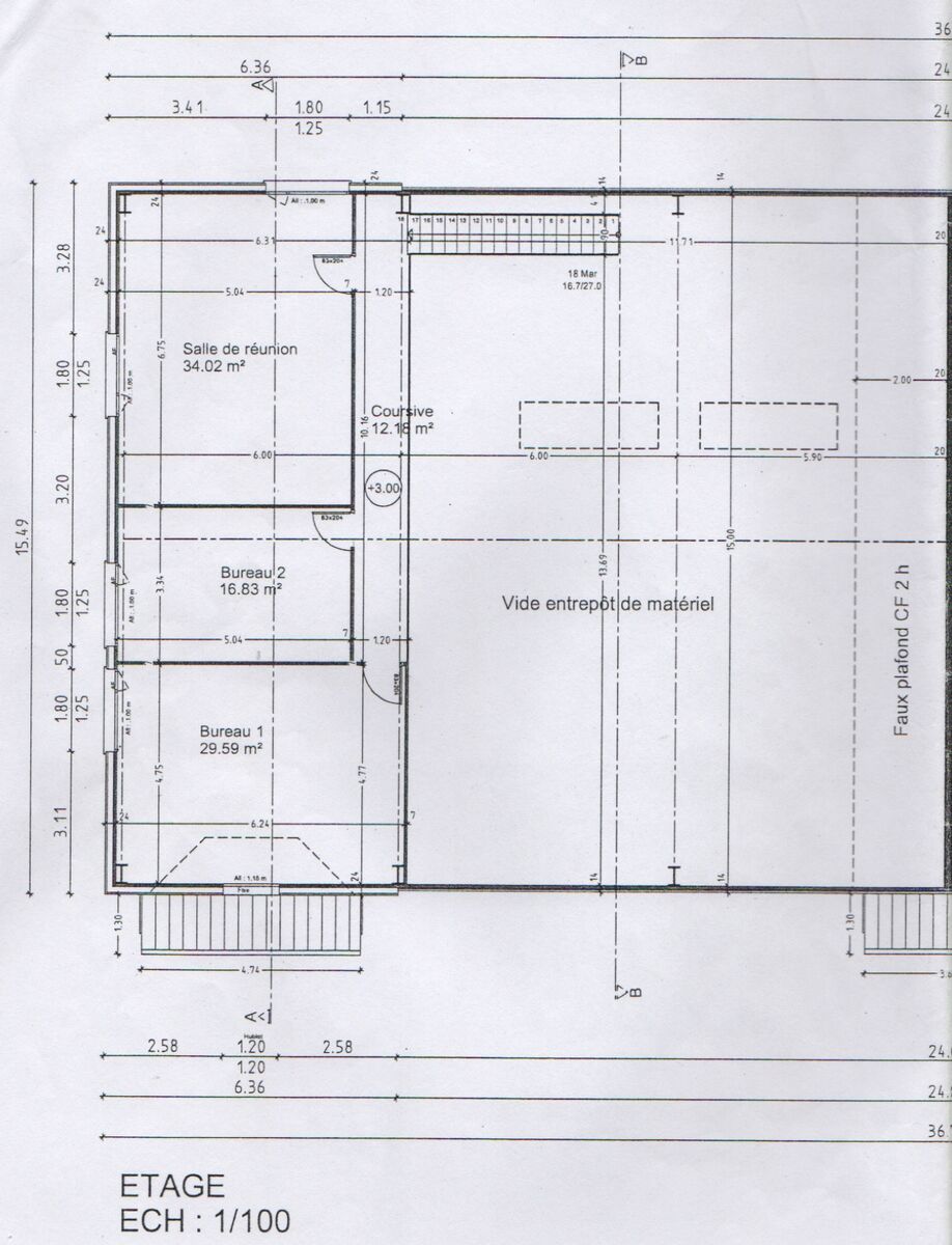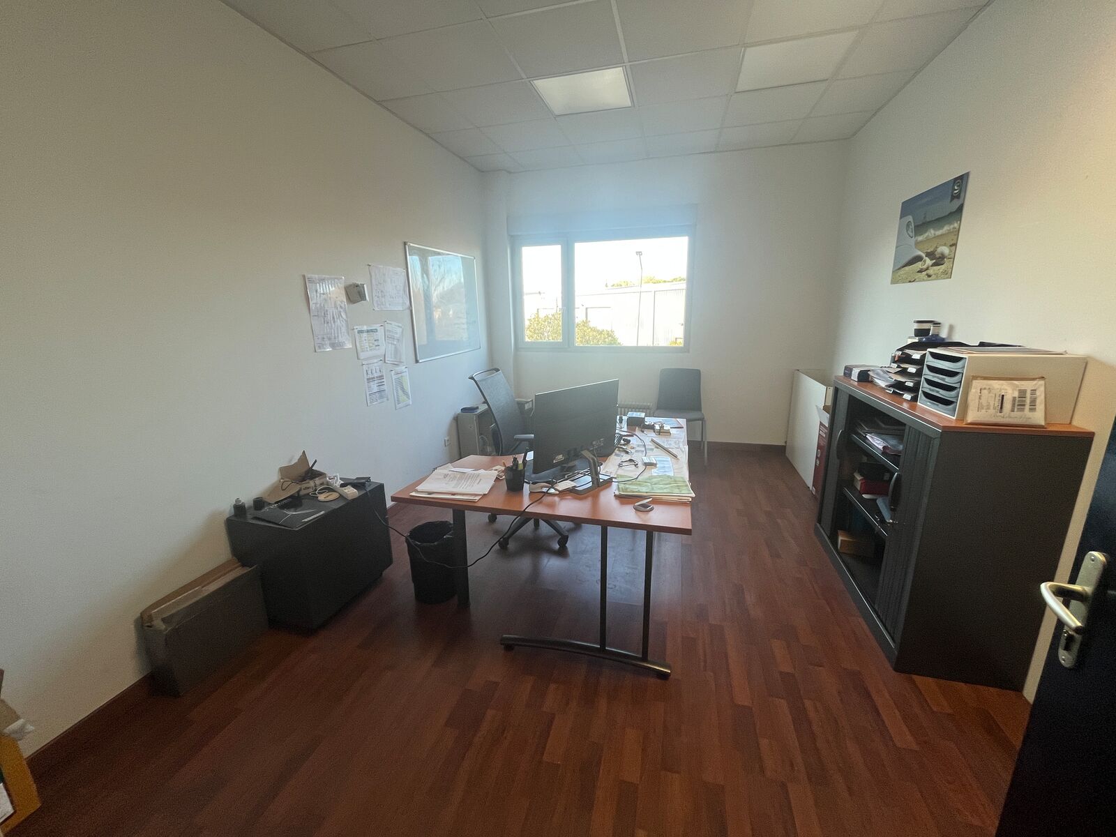 Une partie bureaux a l'étage de 90 m² avec une salle de réunion, trois bureaux, climatisation, câblage informatique et volets roulants électriques